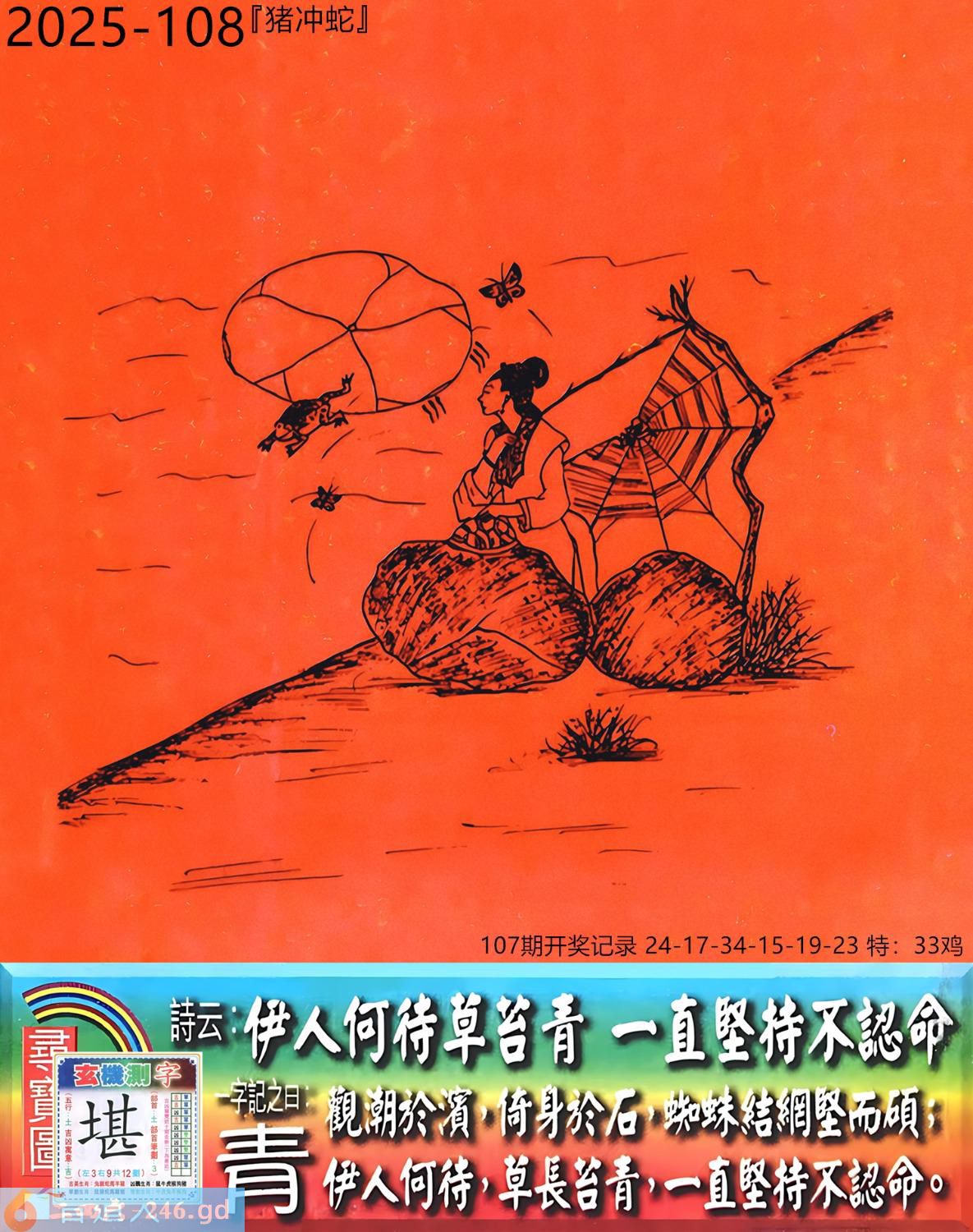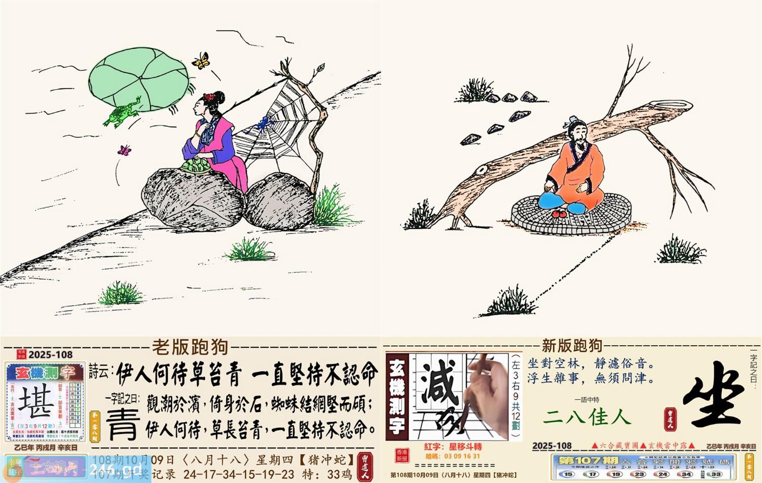 本帖最后由小歪于2025-10-821:50编辑 2025年10月9日108期蛇(乙巳)(钗钏金) 108期:老版跑狗玄機一字記之曰:【青】 詩云:伊人何待草苔青一直堅持不認命 觀潮於濱,倚身於石,蜘蛛結網堅而碩; 伊人何待,草長苔青,一直堅持不認命。 玄機測字:《堪》 密圖詩:打開大門迎財神 《記》:八仙過海顯蛇兔 特碼大小單雙句:天涯海角 今期必中:劉協 108期:特碼歇后語 膏药贴嘴巴-----难开口(号?) 108期正版四字梅花诗:齐头并进。 108期火车头:烧伤马。诗:猪死猴伤,一九三肖对一双。 108期香港第一手欲钱料:床前明月光。 108期曾道人说:“月亮?” 108期另版四字梅:三来三去。 108期香港第一手欲钱料:欲钱看世上好看的动物。 108期曾道人说:“女人二十耍酒疯是什么样的”? 108期:二字經:攻擊 108期:狗熊是特码 108期:智力金壤:黔驴技穷 108期:信箱紅字:【星移斗轉】 108期:【暗碼:03-09-16-31】 108期:一語中特:【二八佳人】 玄機發財圖:圖中明狗藍綠 108期:藏寳圖 新:云残香瘦春犹可 老:逢郎欲语低头笑 禁:虎禁:5尾玄機字《憧》 2025年108期【生活幽默】版 〖你有什么根據〗 夫婦倆坐小汽車,來到鄉裏,丈夫在開車,車子開了很久……。 突然,妻子問:“你不覺得我們迷路了嗎?” 丈夫:“你有什麽根據?我開車能力一直很好的。” 妻子:“你剛軋過去的那條死狗,我們半小時前已經軋過一次了。”