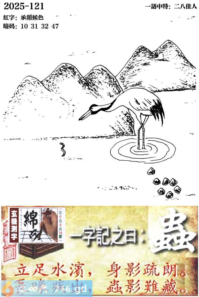 121期跑狗一字記之曰:【蟲】 立足水濱,身影疏朗。 長喙疾出,蟲影難藏。 玄機測字:《綿》 一語中特:二八佳人