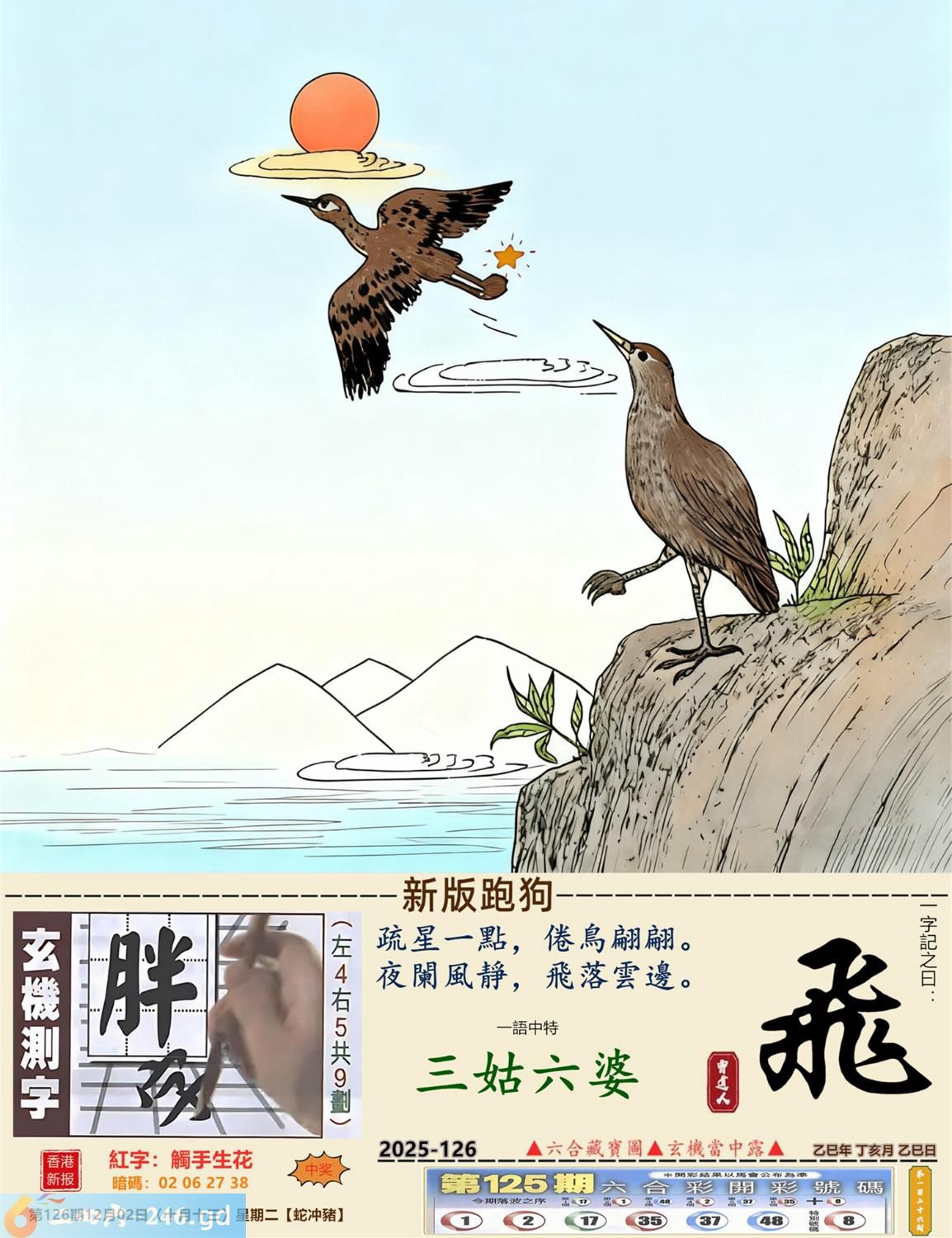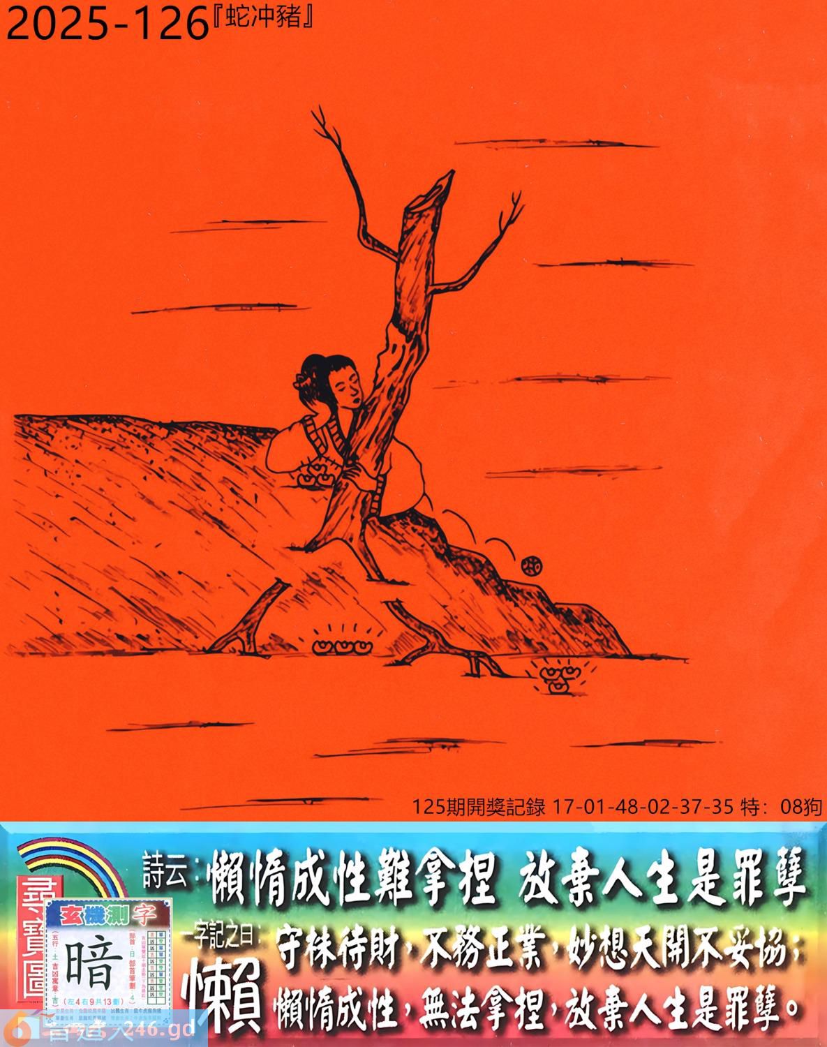 2025年11月29日126期侯(丙申)(金箔金) 126期:老版跑狗玄機一字記之曰:【懶】 詩云:懶惰成性難拿捏放棄人生是罪孽 守株待財,不務正業,妙想天開不妥協; 懶惰成性,無法拿捏,放棄人生是罪孽。 玄機測字:《暗》 密圖詩:十次買一有時中 《記》:一日文章拜布衣 特碼大小單雙句:方圓十里無客棧 今期必中:張飛 126期:特碼歇后語 掉进水里的鞭炮-----给谁都不要 126期正版四字梅花诗:龙争虎斗。 126期火车头:烧伤狗。诗:猴死龙伤,无穷二四过一边。 126期香港第一手欲钱料:大名鼎鼎? 126期曾道人说:“厨娘?” 126期另版四字梅花诗:七十二变。 126期香港第一手欲钱料:欲钱找世界最高楼。 126期曾道人说:“为什么现代的人喜欢赌博”? 126期:二字經:三九 126期:高丽参是特码 126期:智力金壤:烟雨蒙蒙 126期:信箱紅字:【觸手生花】 126期:【暗碼:02062738】 126期:一語中特:【三姑六婆】 發財玄機圖:挖空心思絞盡腦汁 圖中明狗紅藍 126期:藏寳圖 新:造化无心本不知 老:流到前溪无半语 禁:兔禁:8尾玄机字《离》 2025年126期【生活幽默】版 〖好友〗 古時候,有一個和尚跟一個屠夫是好友。 和尚早上要起來念經,而屠夫要起來殺猪。爲了不耽誤各自工作,便約定早上互相叫對方起床。 多年後和尚與屠夫去世了。屠夫去了天堂,和尚却下了地獄。因爲屠夫天天做善事,叫和尚起來念經;而和尚天天叫屠夫起來殺生。
