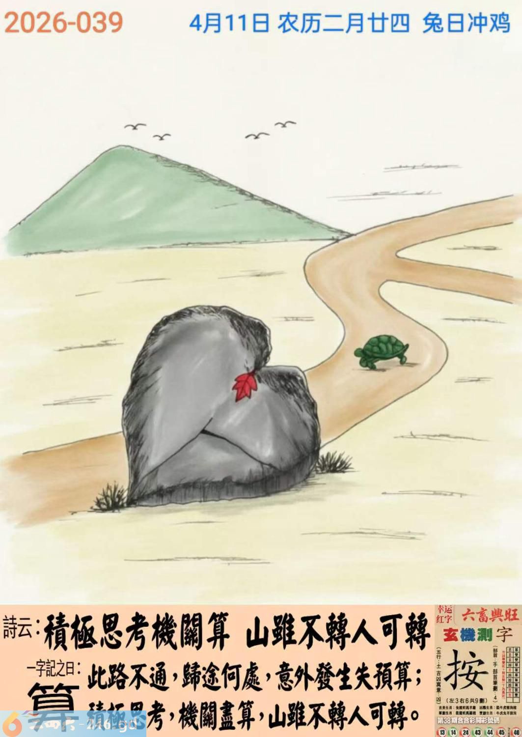 2026年4月11日二月廿四星期六大溪水兔日沖雞 039期:老版跑狗玄機一字記之曰:【算】 詩云:積極思考機關算,山雖不轉人可轉。 此路不通,歸途何處,意外發生失預算; 積極思考,機關盡算,山雖不轉人可轉。 玄機測字:《按》 密圖詩:一臉懵逼買三四 記:落入平川斷其尾 特碼大小單雙句:登上寶座十二年 今期必中:馬岱 039期:特碼歇后語 雷婆找龙王谈心-----天涯海角觅知音 039期正版四字梅花诗:鸿雁传书。 039期火车头:烧伤马。诗:牛死猴伤,一六得二开三一。 039期香港第一手欲钱料:“小”。 039期曾道人说:“龙须?” 039期另版四字梅花诗:大城小爱。 039期香港第一手欲钱料:欲钱看西游记第十五回。 039期曾道人说:“为什么有的人坐车怕晕”? 039期:二字经:红绿。 039期:泥鳅是特码 039期智力金壤:愁眉苦脸 039期信箱紅字:【免開尊口】 039期【暗碼:01-18-29-41】 039期一語中特:【一言九鼎】 發財玄機圖:毛短色亮條紋細長圖中明虎紅藍 039期:藏寳圖 新:片心惆怅清平世 老:风声雷动鸣金铁 禁:猴禁:2尾玄机字《卓》 2026年039期【生活幽默】版 〖流言蜚語〗 某先生是地方上的名人。一天,他像往常一樣在書房裏例覽當日報紙,突然對妻子大聲喊道:"喂,安娜,你看到今天早報上的流言蜚語了嗎,真可笑!他們説,你收拾行装出走了。 你聽見了嗎?安娜,你在哪兒?安娜?啊!"先生對着空空的房間大喊道......