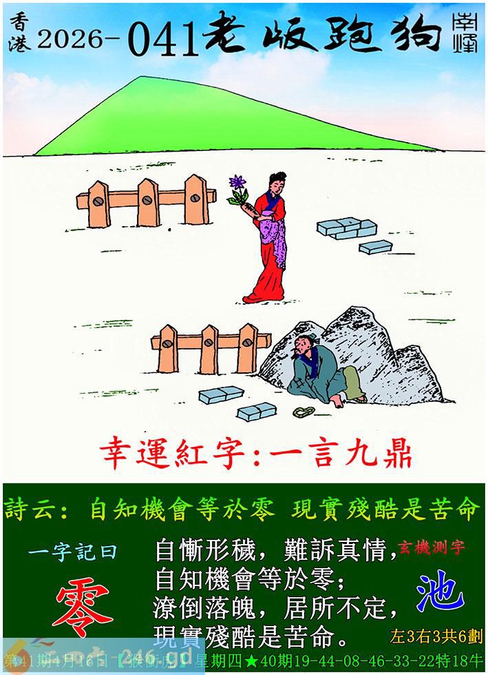 本帖最后由庞太师于2026-4-1520:47编辑 041期老版跑狗一字記之曰:【零】 詩雲:自知機會等於零,現實殘酷是苦命。 自慚形穢,難訴真情,自知機會等於零; 潦倒落魄,居所不定,現實殘酷是苦命。 玄機測字:《池》 整体诗文讲述了夫妻之间·真情无法得到释放, 远赴出征居所不定的它,时而潦倒落魄,現實之殘酷是苦命。 如图所示:一妻家中等,夫君落魄假三后。 一言九鼎:“19火”鼠马同位。 玄机测字:【池·6画】6号元帅有亲邻“13” 一肖:马13
