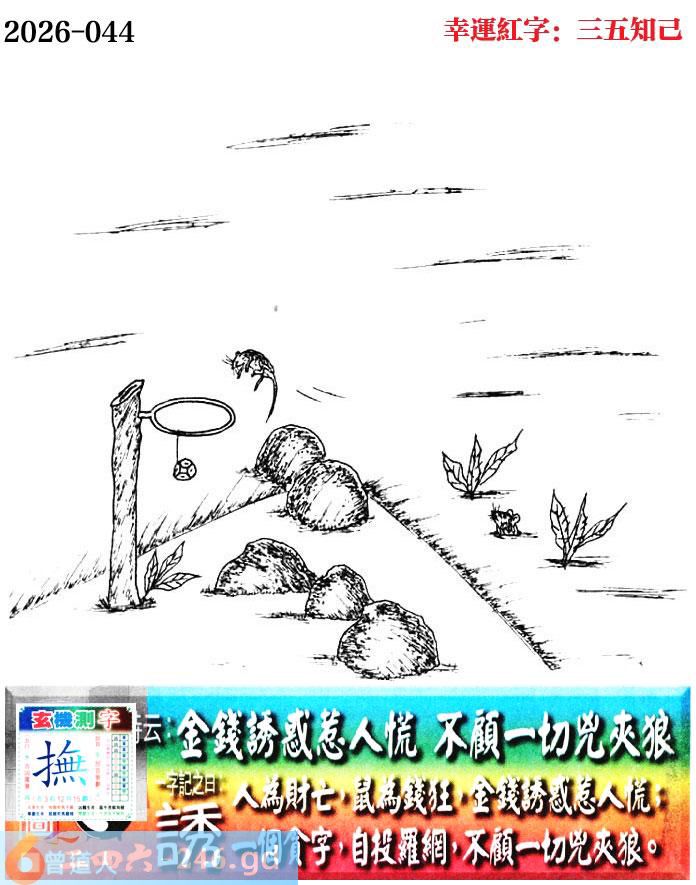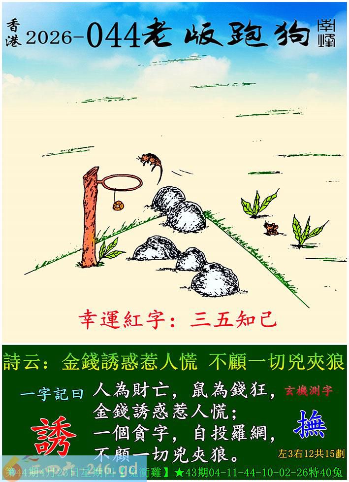 044期老版跑狗一字記之曰:【誘】 詩雲:金錢誘惑惹人慌,不顧一切兇夾狼。 人為財亡,鼠為錢狂,金錢誘惑惹人慌; 一個貪字,自投羅網,不顧一切兇夾狼。 玄機測字:《撫》