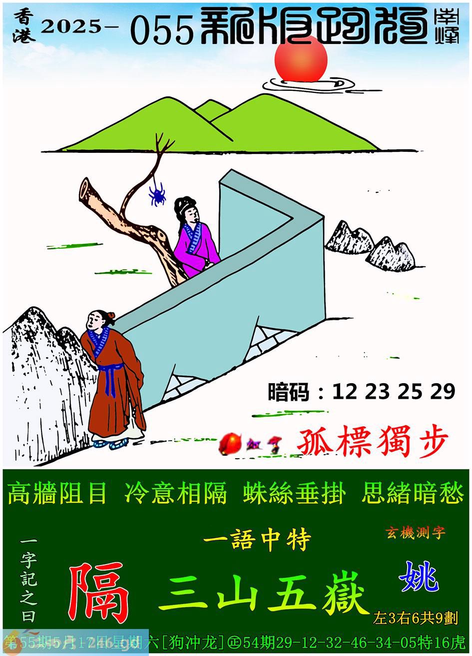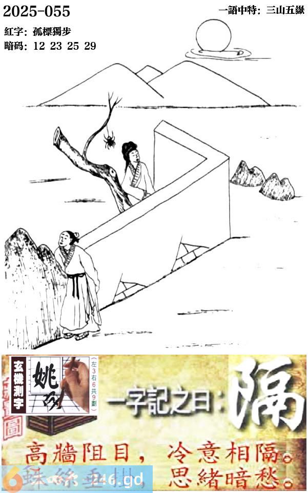 055期跑狗一字記之曰:【隔】 高牆阻目,冷意相隔。 蛛絲垂掛,思緒暗愁。 玄機測字:《姚》 一語中特:三山五嶽