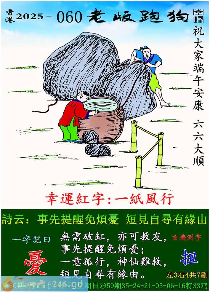 060期老版跑狗一字記之曰:【憂】 詩雲:事先提醒免煩憂,短見自尋有緣由。 無需破缸,亦可救友,事先提醒免煩憂; 一意孤行,神仙難救,短見自尋有緣由。 玄機測字:《扭》