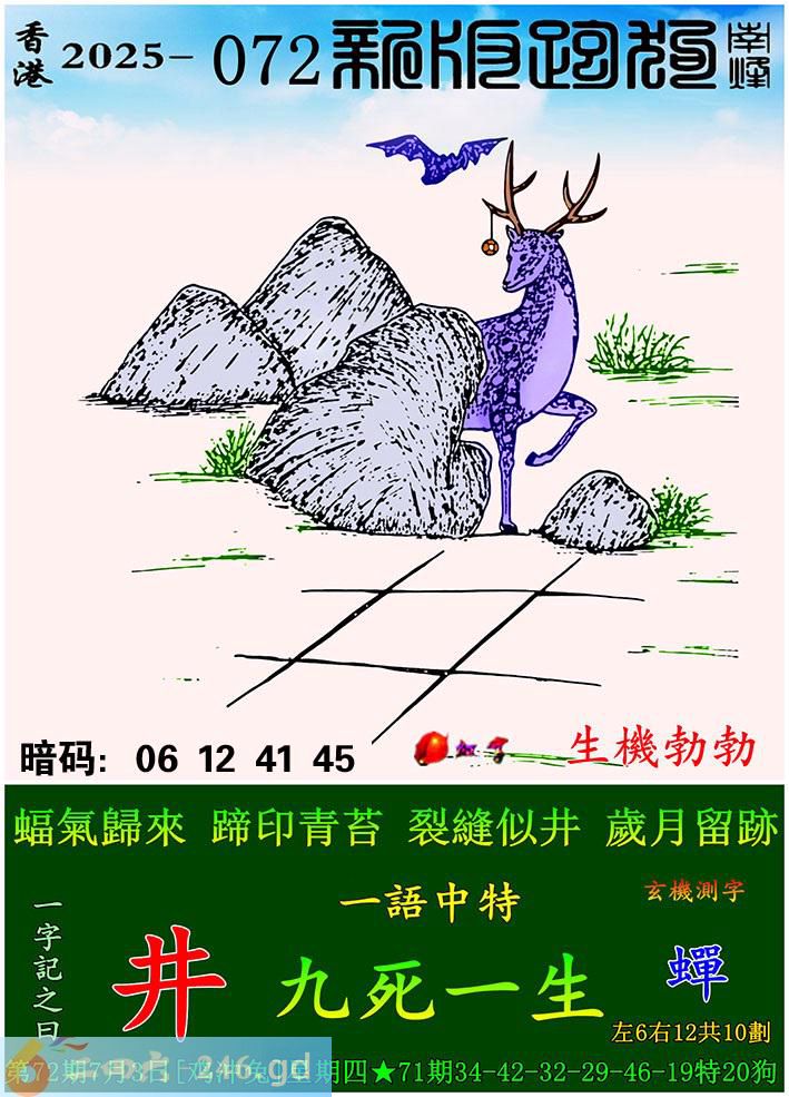072期跑狗一字記之曰:【井】 蝠氣歸來,蹄印青苔。 裂縫似井,歲月留跡。 玄機測字:《蟬》 一語中特:九死一生