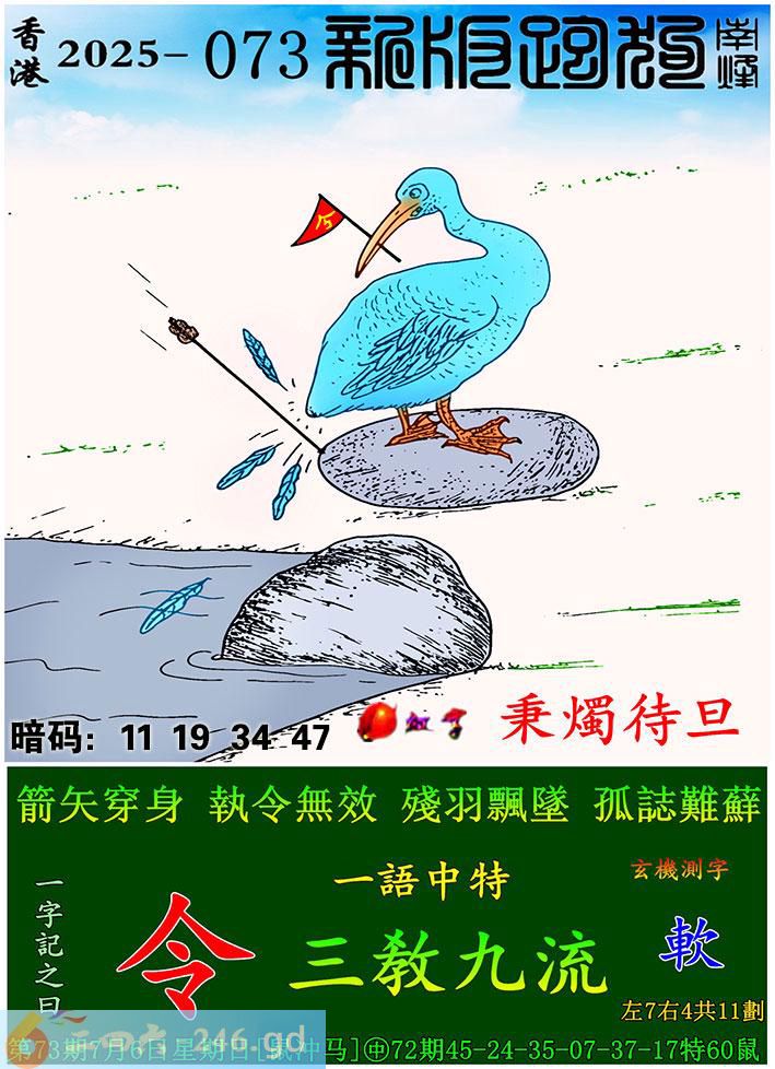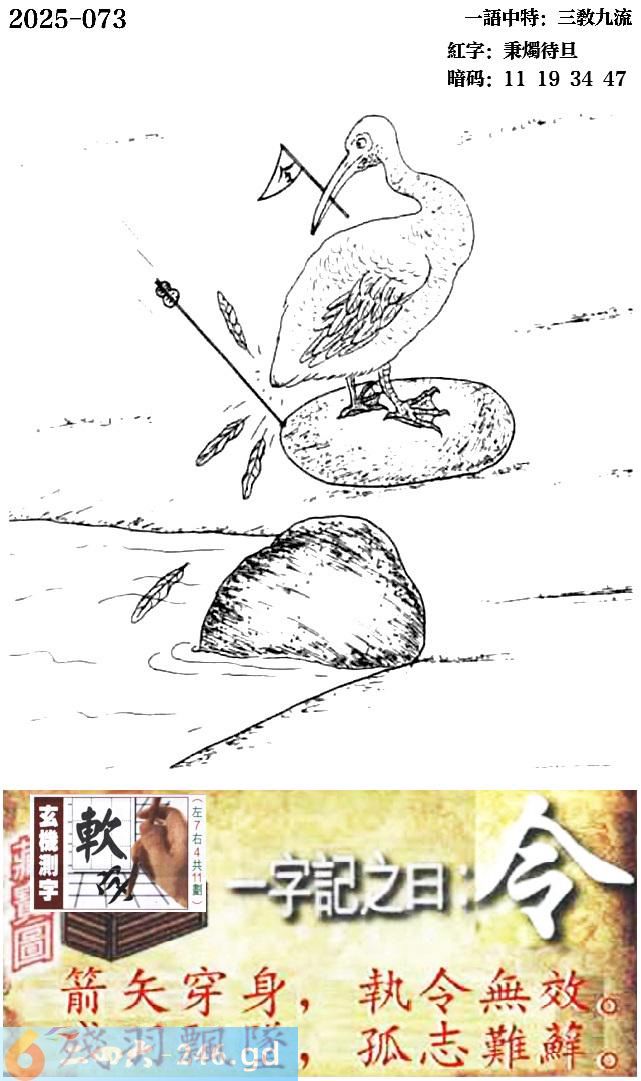 073期跑狗一字記之曰:【令】 箭矢穿身,執令無效。 殘羽飄墜,孤誌難蘚。 玄機測字:《軟》 一語中特:三敎九流
