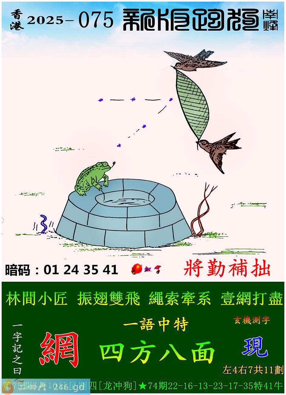 075期跑狗一字記之曰:【網】 林間小匠,振翅雙飛。 繩索牽系,壹網打盡。