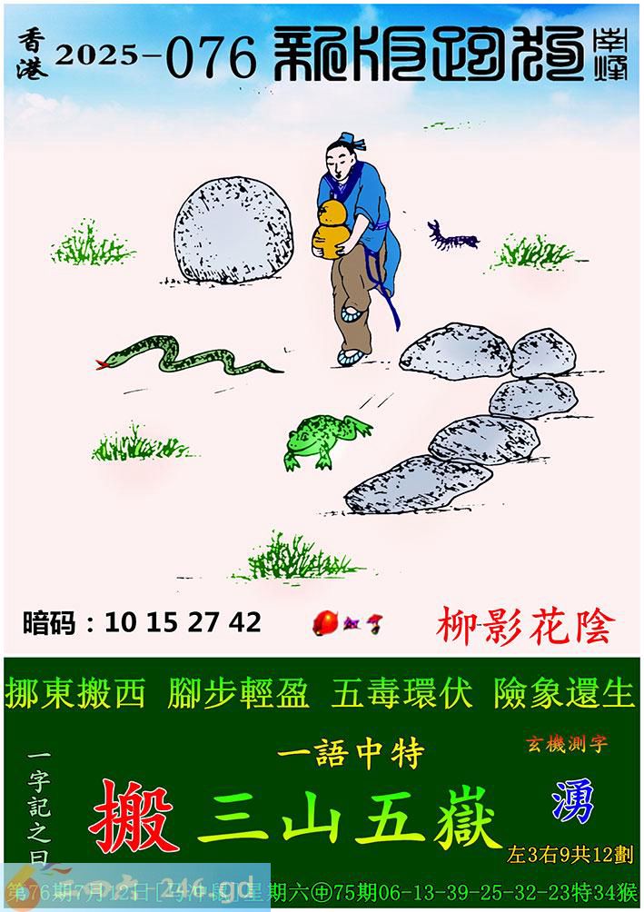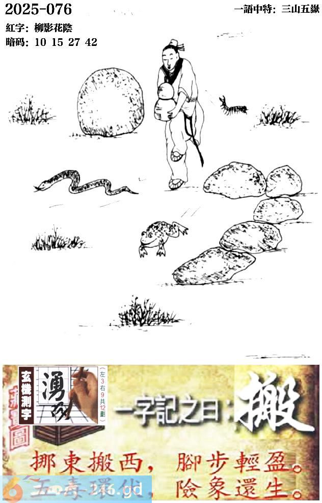 076期跑狗一字記之曰:【搬】 挪東搬西,腳步輕盈。 五毒環伏,險象還生。 玄機測字:《湧》 一語中特:三山五嶽