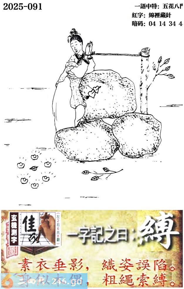 091期跑狗一字記之曰:【縛】 素衣垂影,織姿誤陷。 身似木偶,粗繩索縛。 玄機測字:《佳》 一語中特:五花八門