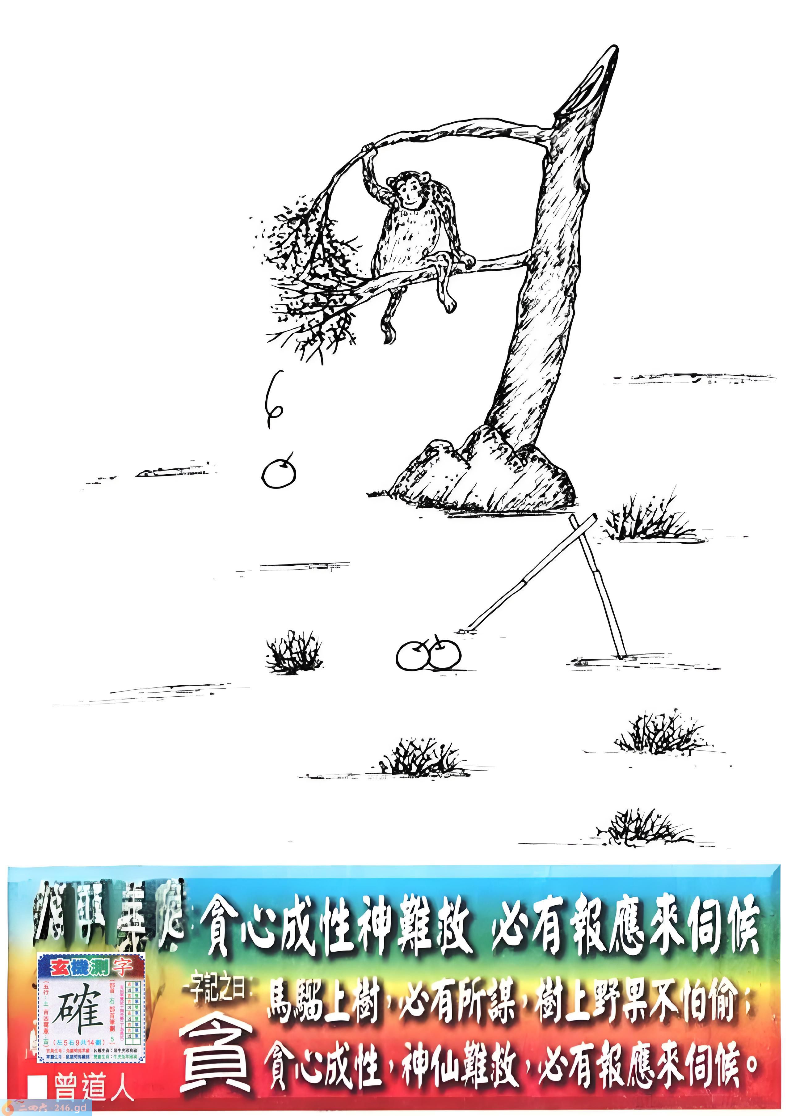 091期老版跑狗一字記之曰:【貪】 詩雲:貪心成性神難救,必有報應來伺候。 馬騮上樹,必有所謀,樹上野果不怕偷; 貪心成性,神仙難救,必有報應來伺候。 玄機測字:《確》