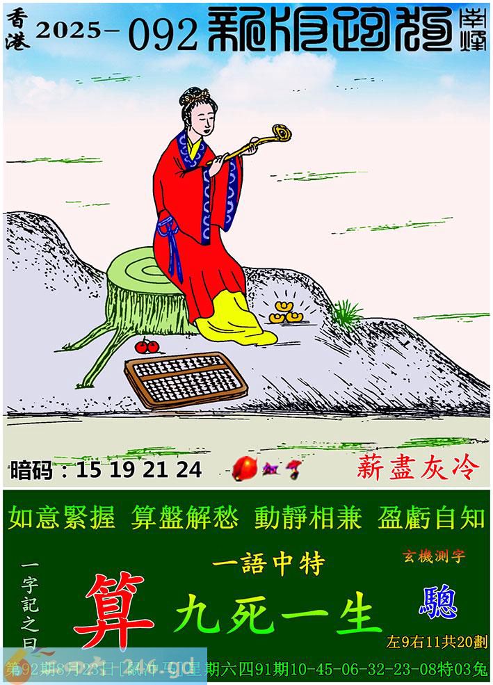 092期跑狗一字記之曰:【算】 如意緊握,算盤解愁。 動靜相兼,盈虧自知。 玄機測字:《驄》 一語中特:九死一生