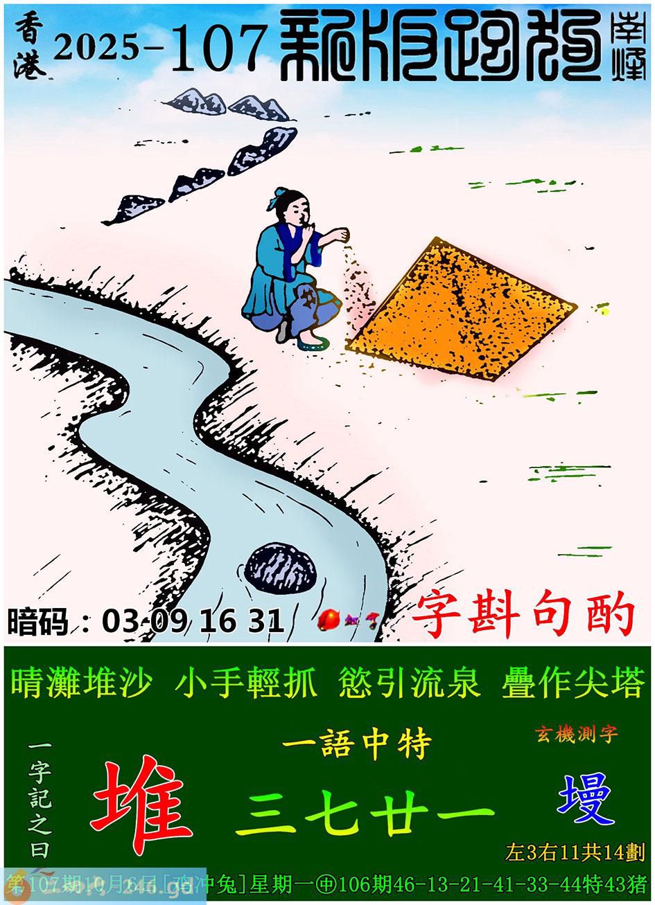 107期跑狗一字記之曰:【堆】 晴灘堆沙,小手輕抓。 慾引流泉,疊作尖塔。 玄機測字:【墁】 一語中特:三七甘一