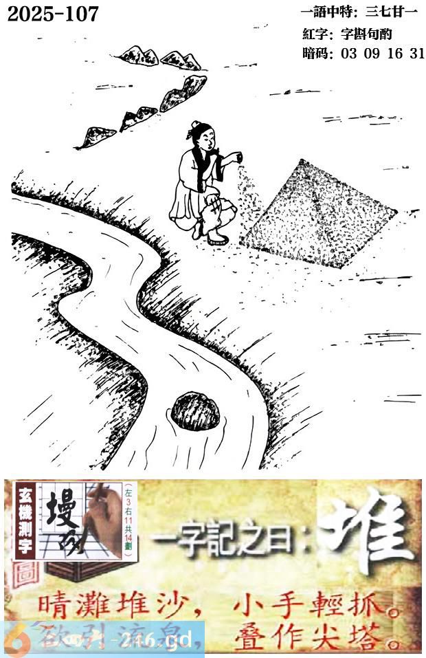 2025107期107期新版跑狗一字記之曰:【堆】 晴灘堆沙,小手輕抓。 慾引流泉,疊作尖塔。