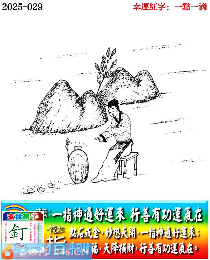 029期老版跑狗一字記之曰:【指】 詩雲:一指神通好運來,行善有功運氣在。 點石成金,妙想天開,一指神通好運來; 平日積福,天降橫財,行善有功運氣在。 玄機測字:《釘》