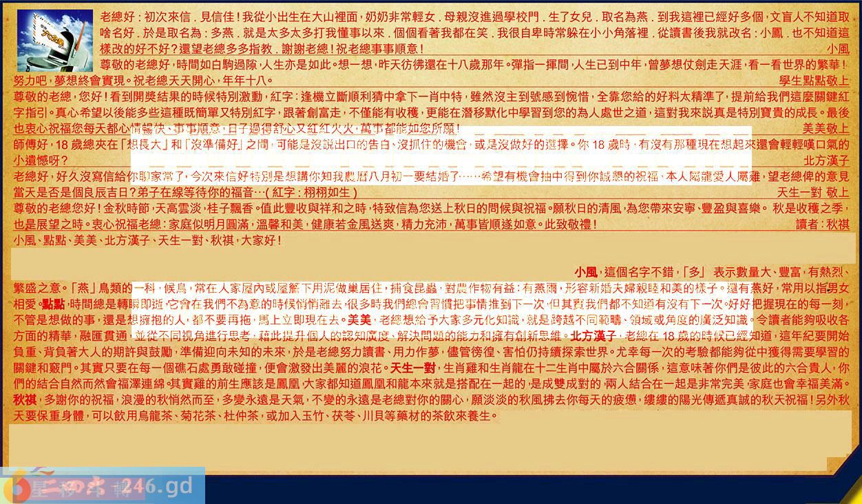 第108期《六合皇信箱文字版》10000%正確!!!正版二四六論壇*精心製作!!! 小風、點點、美美、北方漢子、天生一對、秋祺,大家好! 【1】.老總好:初次來信.見信佳!我從小出生在大山裡面,奶奶非常輕女.母親沒進過學校門.生了女兒.取名為燕.到我這裡已經好多個,文盲人不知道取啥名好.於是取名為:多燕,就是太多太多打我懂事以來.個個看著我都在笑.我很自卑時常躲在小小角落裡.從讀書後我就改名:小鳳.也不知道這樣改的好不好?還望老總多多指教.謝謝老總!祝老總事事順意!小風 〖小風〗:這個名字不錯,「多」表示數量大、豐富,有熱烈、繁盛之意。「燕」鳥類的一科,候鳥常在人家屋內或屋管下用泥做巢居住,捕食昆蟲,對農作物有益:有燕雨,形容新婚夫婦親睦和美的樣子。還有燕好,常用以指男女相爱。 【2】.尊敬的老總好,時間如白駒過隙,人生亦是如此。想一想,昨天彷佛還在十八歲那年。彈指一揮,間人生已到中年,曾夢想仗劍走天涯,看一看世界的繁華!努力吧,夢想終會實現。祝老總天天開心,年年十八。生點點敬上 〖點點〗:時間總是轉瞬即逝,它會在我們不為意的時候俏悄離去,很多時我們總會習慣把事情推到下一次,但其寶我們都不知道有沒有下一次。好好把握現在的每一刻,不管是想做的事,還是想擁抱的人都不要再拖,馬上立即現在去。 【3】.尊敬的老總,您好!看到開獎結果的時候特別激動,紅字:逢機立斷順利猜中拿下一肖中特,雖然沒主到號感到惋惜,全靠您給的好料太精準了,提前給我們這麼關鍵紅字指引。真心希望以後能多些這種既簡單又特別紅字,跟著創富走,不僅能有收穫,更能在潛移默化中學習到您的為人處世之道,這對我來說真是特別寶貴的成長。最後也衷心祝福您每天都心情暢快、事事順意,日子過得舒心又红红火火,萬事都能如您所願!美美敬上 〖美美〗:老總想給予大家多元化知識,就是跨越不同範疇、領域或角度的廣泛知識。令讀者能夠吸收各方面的精華,融匯貫通,並從不同視角進行思考,藉此提升個人的認知廣度、解決問題的能力和擁有創新思維。 【4】.師傅好,18歲總夾在「想長大」和「沒準備好」之間,可能是沒說出口的告白,沒抓住的機會,或是沒做好的選擇。你18歲時,有沒有那種現在想起來還會輕輕嘆口氣的小遺憾呀?北方漢子 〖北方漢子〗:老總在18歲的時候已經知道,這年紀要開始負重、背負著大人的期許與鼓勵,準備迎向未知的未來,於是老總努力讀書、用力作萝,盡管镑徨、害怕仍持續探索世界。尤幸每一次的考驗都能夠從中獲得需要學習的關鍵和竅門。其實只要在每個礁石處勇敢碰撞,便會激發出美麗的浪花。 【5】.老總好,好久沒寫信給你聊家常了,今次来信好特別是想講你知我農曆八月初一要結婚......希望有機會抽中得到你誠懇的祝福,本人屬龍愛人屬雞,望老總俾的意見當天是否是個良辰吉日?弟子在線等待你的福音...(紅字:栩栩如生)天生一對敬上 〖天生一對〗:生肖雞和生肖龍在十二生肖中屬於六合關係,這意味著你們是彼此的六合貴人,你們的結合自然而然會福澤連綿,其實雞的前生應該是鳳凰,大家都知道鳳凰和龍本來就是搭配在一起的,是成雙成對的,兩人結合在一起是非常完美,家庭也會幸福美滿。 【6】.尊敬的老總您好!金秋時節,天高雲淡,桂子飄香。值此豐收與祥和之時,特致信為您送上秋日的問候與祝福。願秋日的清風,為您帶來安寧、豐盈與喜樂。秋是收穫之季,也是展望之時。衷心祝福老總:家庭似明月圓滿,溫馨和美,健康若金風送爽,精力充沛,萬事皆順遂如意。此致敬禮!讀者:秋祺 〖秋祺〗:多謝你的祝福,浪漫的秋悄然而至,多變永遠是天氣,不變的永遠是老總對你的關心,願淡淡的秋風拂去你每天的疲憊,縷縷的陽光傳遞真誠的秋天祝福!另外秋天要保重身體,可以飲用烏龍茶、菊花茶、杜仲茶,或加入玉竹、茯苓、川貝等藥材的茶飲來養生。 紅字:星移斗轉 暗码:11252839 [释义]指季节或时间的变化。 [出处]元·马致远《陈抟高卧》第三折:“直睡的陵迁谷变,石烂松枯,斗转星移。”