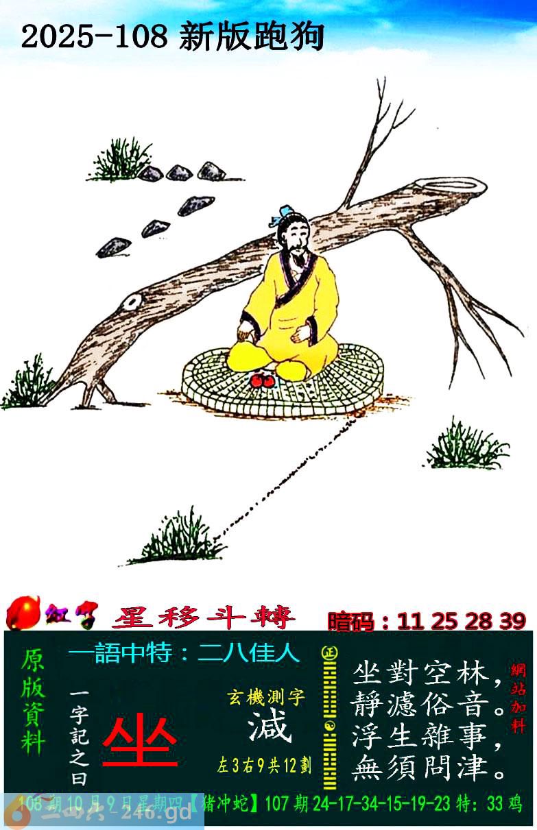 108期跑狗一字記之曰:【坐】 坐對空林,靜濾俗音。 浮生雜事,無須問津。 玄機測字:《減》 一語中特:二八佳人