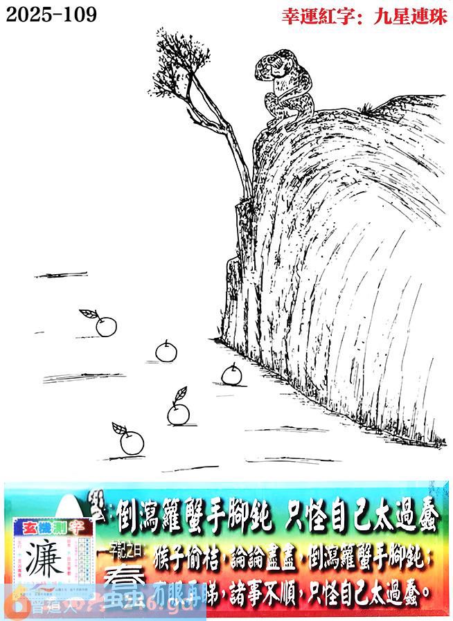 109期老版跑狗一字記之曰:【蠢】 詩雲:倒瀉籮蟹手腳鈍,只怪自己太過蠢。 猴子偷桔,論論盡盡,倒瀉籮蟹手腳鈍; 冇眼再睇,諸事不順,只怪自己太過蠢。 玄機測字:《濂》