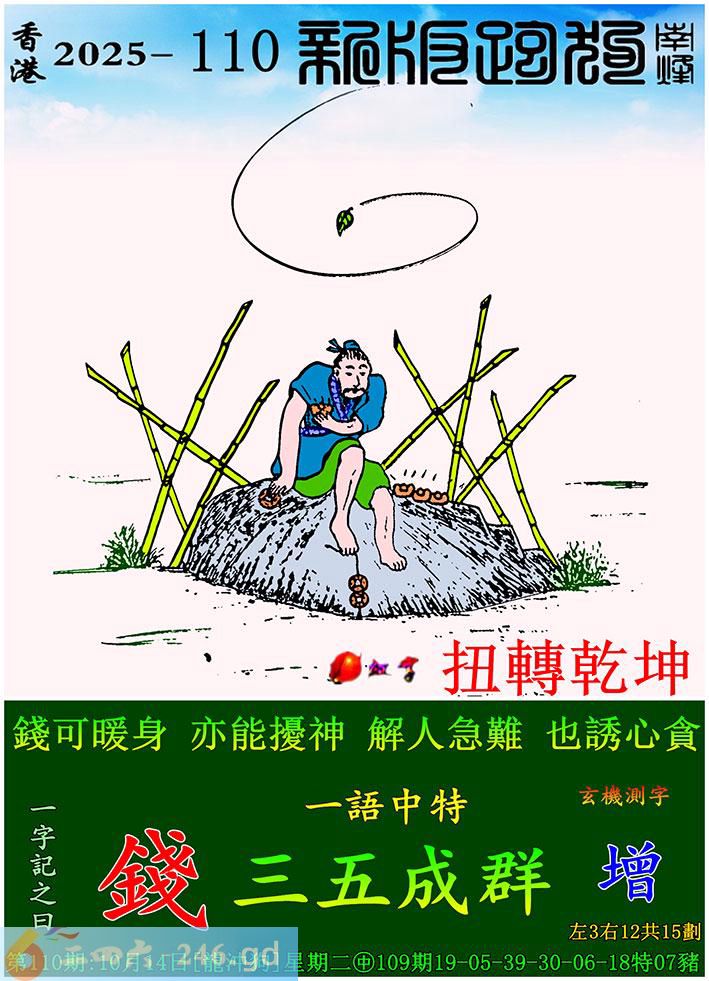 110期跑狗一字記之曰:【錢】 錢可暖身,亦能擾神。 解人急難,也誘心貪。 玄機測字:《增》 一語中特:三五成群
