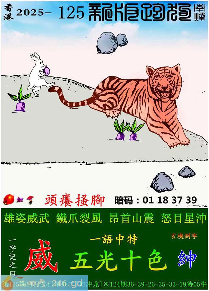 125期跑狗一字記之曰:【威】 雄姿威武,鐵爪裂風。 昂首山震,怒目星沖。 玄機測字:《紳》 一語中特:五光十色