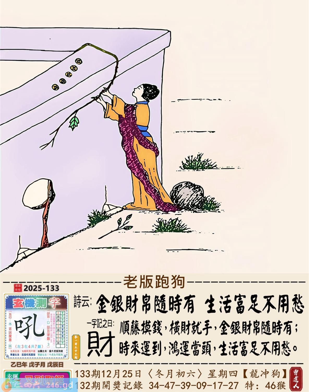2025年12月25日133期狗(壬戌)(大林木) 133期:老版跑狗玄機一字記之曰:【財】 詩雲:金銀財帛隨時有生活富足不用愁 順藤摸錢,橫財就手,金銀財帛隨時有; 時來運到,鴻運當頭,生活富足不用愁。 玄機測字:《吼》 密圖詩:三個和尚沒水喝 《記》:一江春水向東流 特碼大小單雙句:八戒戲嫦娥 今期必中:張飛 133期:特碼歇后語 尿壶打掉把儿-----光剩一张嘴 133期正版四字梅花诗:高不可攀。 133期火车头:烧伤马。诗:龙死兔伤,四六分明把数算。 133期香港第一手欲钱料:牛。 133期曾道人说:“随遇而安?” 133期另版四字梅花诗:穷意识就。 133期香港第一手欲钱料:欲钱看西游记第二回。 133期曾道人说:“男人三十喝酒时喜欢做什么事”? 133期:二字經:看頭 133期:皇帝是特码 133期:智力金壤:一丘之貉 133期:信箱紅字:【螻蟻偷生】 133期:【暗碼:02-31-33-41】 133期:一語中特:【二人三足】 發財玄機圖:雄才大略氣慨威武圖中明龍紅綠 133期:藏寳圖 新:斗牛不神箕独灵 老:轻舸帷恐东下迟 禁:牛禁:0尾玄機字《弦》 2025年133期【生活幽默】版 〖在公厠裏〗 在公厕裏,忽然聽到間有人説話:"哥們兒,有手纸嗎?" 我翻了翻口袋:"抱歉,没有。" 過了幾秒鐘,那人又問:"那有小塊報纸嗎?"我無奈地一笑:"對不起,没有,我祗是來小便的。" 又過了幾秒鐘,間門縫塞出一張10元人民幣:"能幫我换成1塊錢的嗎?" 我把錢遞過去,間裏傅來一聲咆哮:"你别給我十個硬幣啊!"