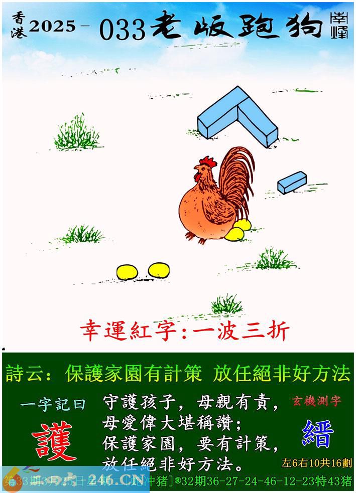 033期老版跑狗一字記之曰:【護】 詩雲:保護家園有計策,放任絕非好方法。 守護孩子,母親有責,母愛偉大堪稱讚; 保護家園,要有計策,放任絕非好方法。 玄機測字:《縉》