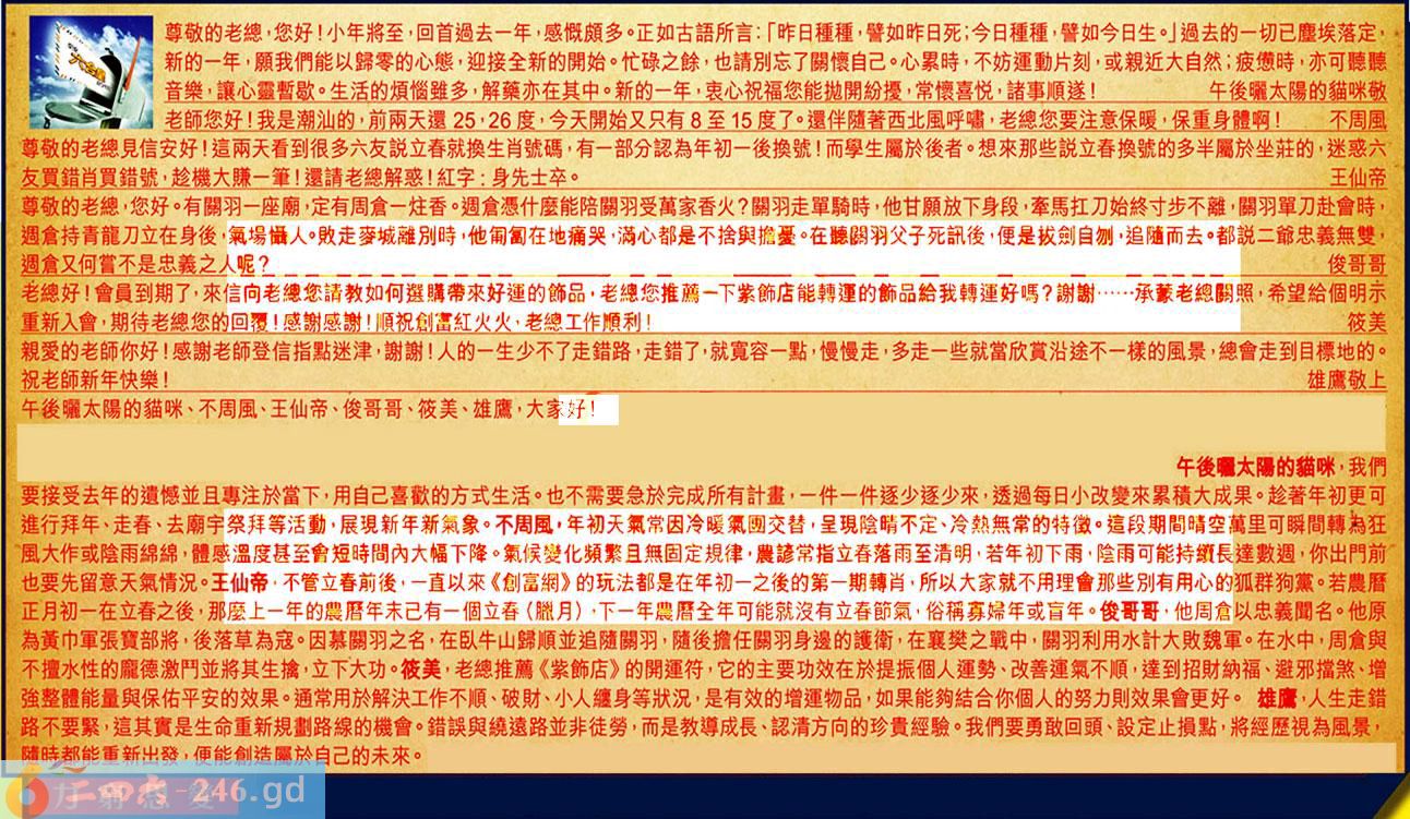 第026期《六合皇信箱文字版》10000%正確!!!正版二四六論壇*精心製作!!! 午後曬太陽的貓咪、不周風、王仙帝、俊哥哥、筱美、雄鹰,大家好! 【1】.尊敬的老總,您好!小年將至,回首過去一年,感慨頗多。正如古語所言:「昨日種種,譬如昨日死;今日種種,譬如今日生。過去的一切已麈埃落定,新的一年,願我們能以歸零的心態,迎接全新的開始。忙碌之餘,也請別忘了關懷自己。心累時,不妨運動片刻,或親近大自然;疲憊時,亦可聽聽音樂,讓心靈暫歇。生活的煩惱雖多,解藥亦在其中。新的一年,衷心祝福您能抛開紛擾,常懷喜悦,諸事順遂!午後曬太陽的猫咪敬 〖午後嘱太陽的猫咪〗:我們要接受去年的遺憾並且專注於當下,用自己喜歡的方式生活。也不需要急於完成所有計畫,一件一件逐少逐少來,透過每日小改變來累積大成果。趁著年初更可進行拜年、走春、去廟宇祭拜等活動,展現新年新氣象。 【2】.老師您好!我是潮汕的,前兩天還25,26度,今天開始又只有8至15度了。還伴随著西北風呼啸,老總您要注意保暖,保重身體啊!不周風 〖不周風〗:年初天氣常因泠暖氣團交替,呈現陰晴不定、冷熱無常的特徵。這段期間晴空萬里可瞬間轉為狂風大作或陰雨綿綿,體感溫度甚至會短時間內大幅下降。氣侯變化頻繁且無固定規律,農諺常指立春落雨至清明,若年初下雨,陰雨可能持镦長達數週,你出門前也要先留意天氣情況。 【3】.尊敬的老總見信安好!這兩天看到很多六友説立春就換生肖號碼,有一部分認為年初一後換號!而學生屬於後者。想來那些説立春換號的多半屬於坐莊的,迷惑六友買錯肖買錯號,趁機大赚一筆!還請老總解惑!紅字:身先士卒。王仙帝 〖王仙帝〗:不管立春前後,一直以來《創富網》的玩法都是在年初一之後的第一期轉肖,所以大家就不用理會那些別有用心的狐群狗黨。若農暦正月初一在立春之後,那麼上一年的農暦年未已有一個立春(臘月),下一年農暦全年可能就沒有立春節氣,俗稱寡婦年或盲年。 【4】.尊敬的老總,您好。有關羽一座廟,定有周倉一灶香。週倉憑什麼能陪關羽受萬家香火?關羽走單騎時,他甘願放下身段,牽馬扛刀始終寸步不離,關羽單刀赴會時週倉持青龍刀立在身後,氣場人。敗走麥城離別時,他匍匐在地痛哭滿心都是不捨與擔憂。在聽闕羽父子死訊後,便是拔劍自刎追随而去。都説二爺忠義無雙週倉又何當不是忠義之人呢?俊哥哥 〖俊哥哥〗:他周倉以忠義聞名。他原為黄巾軍張寶部將,後落草為寇。因慕關羽之名,在卧牛山歸順並追隨關羽,隨後擔任關羽身邊的護衛,在襄樊之戰中,關羽利用水計大敗魏軍。在水中,周倉與不擅水性的靡德激鬥並將其生擒,立下大功。 【5】.老總好!會員到期了,來信向老總您請教如何選購帶來好運的飾品,老總您推薦一下紫飾店能轉運的飾品給我轉運好嗎?謝謝......承蒙老總關照,希望給個明示重新入會,期待老總您的回覆!感謝感謝!順祝創富紅火火,老總工作順利!筱美 〖筱美〗:老總推薦《紫飾店》的開運符,它的主要功效在於提振個人運勢、改善逋氣不順,達到招財納福、避邪擋煞增強整體能量與保佑平安的效果。通常用於解決工作不順、破財、小人纏身等狀況,是有效的增運物品,如果能夠結合你個人的努力則效果會更好。 【6】.親愛的老師你好!感謝老師登信指點迷津,謝謝!人的一生少不了走錯路,走錯了,就寛容一點,慢慢走,多走一些就當欣賞沿途不一樣的風景,總會走到目標地的。祝老師新年快樂!雄鷹敬上 〖雄鹰〗:人生走錯路不要緊,這其實是生命重新規劃路線的機會。錯誤與繞遠路並非徒勞,而是教導成長、認清方向的珍貴經驗。我們要勇敢回頭、設定止損點,將經歷視為風景,隨時都能重新出發,便能創造屬於自己的未來。 紅字:力窮思變 暗码:01333640 [释义]指人处于十分穷困、无路可走的境地时就会努力改变现状。 [出处]《周易·系辞下》:“神而化之,使民宜之。易穷则变,变则通,通则久。”