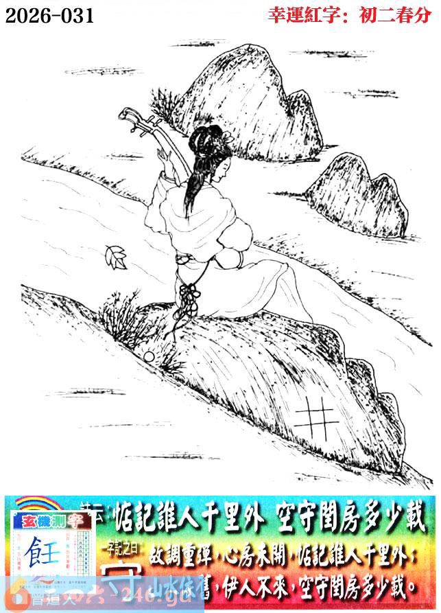 031期老版跑狗一字記之曰:【守】 詩雲:惦記誰人千里外,空守閨房多少載。