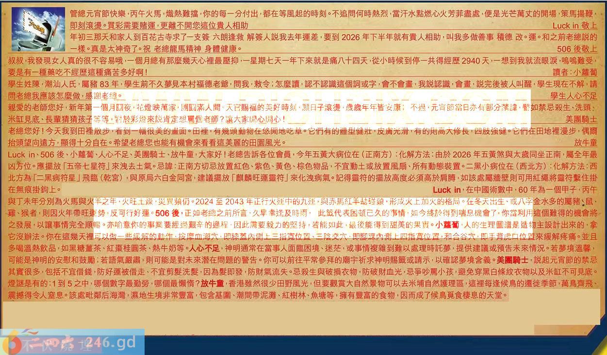 第032期《六合皇信箱文字版》10000%正確!!!正版二四六論壇*精心製作!!! 、506後、小蘿蔔、人心不足、美團騎士、放牛童,大家好!老總告訴各位會員,今年五黃大病位在(正南方):化解方法:由於2026年五黃煞與太歲同坐正南,屬全年最凶方位。應擺放「五帝七星符」來洩去土氣。忌諱:正南方切忌放置紅色、紫色、黃色、棕色物品,不宜動土或放置風扇、所有動態裝置。二黑小病位在(西北方):化解方法:西北方為「二黑病符星」飛臨(乾宮),與原局六白金同宮,建議擺放「麒麟旺運靈符」來化洩病氣。記得靈符的擺放高度必須高於肩膊,如該處屬牆壁則可用紅繩將靈符繫住掛在無痕掛鉤上。 【1】.管總元宵節快樂,丙午火馬,熾熱難擋,你的每一分付出,都在等風起的時刻。不追問何時熱烈,當汗水點燃心火芳菲盡處,便是光芒萬丈的開場,策馬揚鞭,即刻滚漫。買彩需要賭運,更離不開您這位貴人相助敬上 〖〗:在中國術數中,60年為一個甲子,丙午與丁未年分別為火馬與火羊之年,火旺土燥,災異频仍。2024至2043年正行火運中的九運。與赤馬紅羊劫碰頭,形成火上加火的格局。在冬天出生、或八字金水多的屬猪、鼠、難、猴者,則因火年帶旺運勢,反可行好運。 【2】.年初三那天和家人到百花古寺求了一支簽六朗逢救解簽人説我去年運差,要到2026年下半年就有貴人相助,叫我多做善事積德改。運。和之前老總説的一樣。真是太神奇了。祝老總龍馬精神身體健康。506後敬上 〖506後〗:正如老總之前所言,久旱幸逢及時雨,此簸代表困頓已久的事情,如今終於得到喘息機會了,你當利用這個難得的機會將之發展,以讓事情完全順暢。亦喻意你的事業要經過艱辛的過程,因此需要毅力的堅持,若能如此最後能得到甜美的果實。 【3】.叔叔,我發現女人真的很不容易哦,一個月總有那麼幾天心裡最壓抑,一星期七天一年下來就是痛八十四天,從小時候到停一共得經歷2940天,一想到我就流眼淚,鳴鳴難受要是有一種藥吃不經歷這種痛苦多好啊!讀者:小蘿萄 〖小蘿蔔〗:人的生理圖譜是造物主設計出來的,拿它沒辦法。你在這幾天裡可以做一些緩解的動作,按摩血海穴,即膝蓋內側上三指寛位置、三陰交穴,即腳踝丙側上四指實位置,和合谷穴,即手背虎口位置來緩解疼痛。並且多喝溫熱飲品,如黑糖薑茶、紅棗桂圆茶、熱牛奶等。 【4】.學生姓陳,潮汕人氏,屬猪83年,學生前不久夢見本村福德老爺,問我,敕令;怎麼讀,認不認識這個詞或字,會不會畫,我説認識,會畫,説完後被人叫醒,學生現在不解,請問老總我應該怎麼做,感謝老總。學生人心不足 〖人心不足〗:神明通常在當事人面臨困境、迷茫,或事情複雜到難以處理時託夢,提供建議或預告未來情況。若萝境溫馨,可能是神明的安慰和鼓勵;若語氣嚴肅,則可能是對未來潛在問題的警告。你可以前往平常參拜的廟宇祈求神明賜籤或請示,以確認萝境含義。 【5】.親愛的老師您好,新年第一個月圓夜,花燈映萬家,團圓满人間,天官赐福的美好時刻,願日子滚燙,歲歲年年皆安康,不過,元宵節當日亦有部分禁諱,譬如禁忌殺生、洗頭、米缸見底、長輩猜猜孩子等等,對於彩燈來説肯定想罵個老師?讓大家開心開心!美團騎士 〖美團騎士〗:説起元宵節的禁忌其實很多,包括不宜借錢,防好運被借走、不宜剪髪洗髪,因為髪即發,防財氣流失・忌殺生與破損衣物,防破財血光,忌爭吵罵小孩,避免穿黑白條紋衣物以及米缸不可見底。燈謎是有的:1到5之中,哪個數字最勤勞,哪個最懶惰? 【6】.老總您好!今天我到田裡散步,看到一幅很美的畫面。田裡,有幾頭動物在悠閒地吃草。它們有的體型健壯,皮膚光滑,有的則高大修長,四肢強健。它們在田地裡漫步,偶爾抬頭望向遠方,顯得十分自在。希望老總您也能有機會來看看這美麗的田圈風光。放牛童 〖放牛童〗:香港雖然很少田野風光,但要觀賞大自然景物可以去米埔自然護理區,這裡每逢候鳥的遷徙季節,萬烏齊飛、震撼得令人窒息。該處毗鄰后海灣,濕地生境非常豐富,包舍基圍、潮間帶泥灘、紅樹林、魚塘等,擁有豐富的食物,因而成了候鳥觅食棲息的天堂。 紅字:不伏燒埋 暗码:05313339 [释义]比喻不伏罪或不听劝解。 [出处]元·康进之《地逵负棘》第四折:“休道你兄弟不伏烧埋,由你便直打到梨花月上来。”