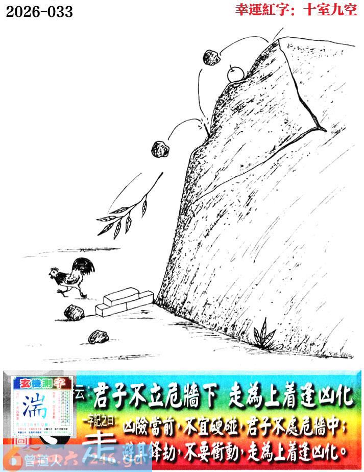 033期老版跑狗一字記之曰:【走】 詩雲:君子不立危牆下,走為上著逢凶化。 凶險當前,不宜硬碰,君子不立危牆下; 避其鋒劫,不要衝動,走為上著逢凶化。 玄機測字:《湍》