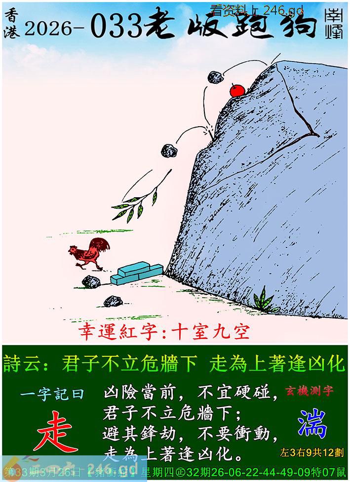 033期老版跑狗一字記之曰:【走】 詩雲:君子不立危牆下,走為上著逢凶化。