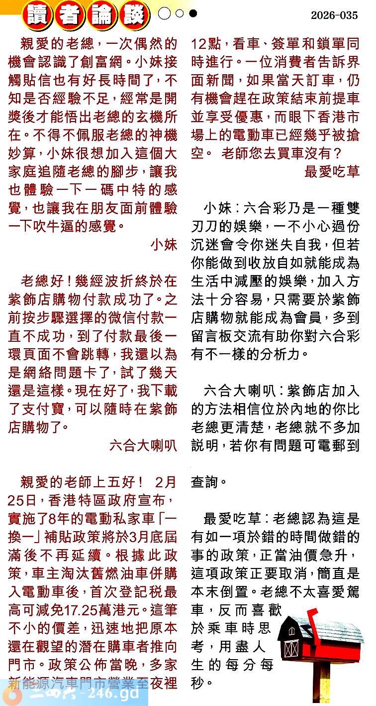 第035期讀者論談 1.親愛的老總,一次偶然的機會認識了創富網。小妹接觸貼信也有好長時間了,不知是否經驗不足,經常是開獎後才能悟出老總的玄機所在。不得不佩服老總的神機妙算,小妹很想加入這個大家庭追隨老總的腳步,讓我也體驗一下一碼中特的感覺,也讓我在朋友面前體驗一下吹牛逼的感覺。小妹 〖小妹〗:六合彩乃是一種雙刃刀的娛樂,一不小心過份沉迷會令你迷失自我,但若你能做到收放自如就能成為生活中減壓的娛樂,加入方法十分容易,只需要於紫飾店購物就能成為會員,多到留言板交流有助你對六合彩有不一樣的分析力。 2.老總好!幾經波折終於在紫飾店購物付款成功了。之前按步驟選擇的微信付款一直不成功,到了付款最後一環頁面不會跳轉,我還以為是網絡問題卡了,試了幾天還是這樣。現在好了,我下載了支付寶,可以隨時在紫飾店購物了。六合大喇叭 〖六合大喇叭〗:紫飾店加入的方法相信位於內地的你比老總更清楚,老總就不多加说明,若你有問題可電郵到查詢。 3.親愛的老師上五好!2月25日,香港特區政府宣布,實施了8年的電動私家車「一換一」補貼政策將於3月底届滿後不再延續。根據此政策,車主淘汰舊燃油車併購入電動車後,首次登記税最高可減免17.25萬港元。這筆不小的價差,迅速地把原本還在觀望的潛在購車者推向門市。政策公佈當晚,多家新能源汽車門市訾業至夜裡12點,看車、簽單和鎖單同時進行。一位消费者告訴界面新聞,如果當天訂車,仍有機會趕在政策結束前提車並享受優惠,而眼下香港市場上的電動車已經幾乎被搶空。老師您去買車沒有?最愛吃草 〖最愛吃草〗:老總認為這是有如一項於錯的時間做錯的事的政策,正當油價急升,這項政策正要取消,簡直是本末倒置。老總不太喜愛駕車,反而喜歡於乘車時思考,用盡人生的每分每秒。