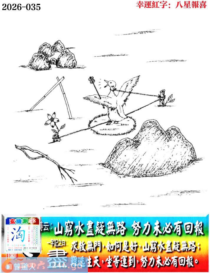 035期老版跑狗一字記之曰:【盡】 詩雲:山窮水盡疑無路,努力未必有回報。 求救無門,如何是好,山窮水盡疑無路; 難逃生天,坐等運到,努力未必有回報。 玄機測字:《洶》