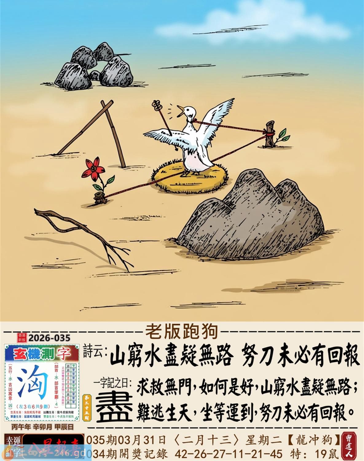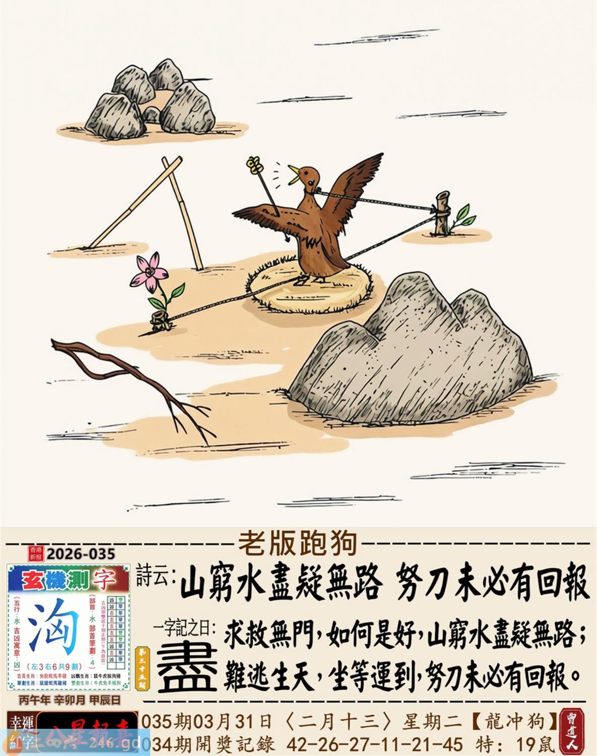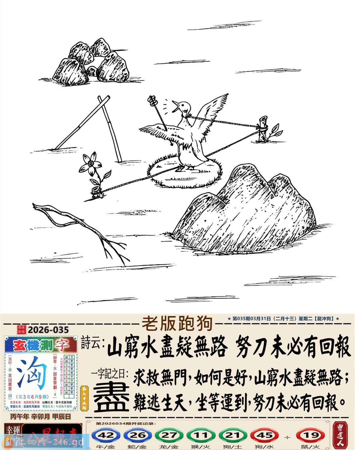 2026年3月31日二月十三星期二覆灯火龙日冲狗 035期:老版跑狗玄機一字記之曰:【盡】 詩云:山窮水盡疑無路,努力未必有回報。 求救無門,如何是好,山窮水盡疑無路; 難逃生天,坐等運到,努力未必有回報。 玄機測字:《洶》 密圖詩:一對核桃一對棗 記:試看宮中有月兔 特碼大小單雙句:伸手要錢 今期必中:黃月英 035期:特碼歇后語 千眼佛-----瞒不过 035期正版四字梅花诗:六根清净。 035期火车头:烧伤鸡。诗:牛死马伤,没有四脚水上走。 035期香港第一手欲钱料:三点。 035期曾道人说:“男人?” 035期另版四字梅花诗:农行理财。 035期香港第一手欲钱料:欲钱台湾金二角的大小。 035期曾道人说:“为什么年轻人喜欢开跑车”? 035期:二字经:红绿。 035期:床下有特码 035期:智力金壤:庖丁解牛 035期紅字:【鍥而不舍】 035期暗码:【16192047】 035期一語中特:【三山五嶽】 發財玄機圖:探索周圍儲備充足圖中明鼠藍綠 035期:藏寶圖 新:蕉留庭户因供字 老:日长暗记残香篆 禁:蛇禁:8尾玄機字《渐》 2026年035期【生活幽默】版 〖狗明星〗 有一天有一個人帶着一條狗到唱片公司,他説他是這條狗的經纪人,并說他這條狗會唱歌跳舞,老板不相信,就叫小狗表演一次。當音樂響起,小狗跟着音樂載歌載舞,老板目瞪口呆的看着小狗,一邊想着這一次撿到摇錢樹了,就趕快拿出合同希望與狗簽約,没想到忽然一條大狗衝進來,把小狗銜走了。 老板問:"怎磨回事?"經纪人無奈的表 示:"唉!那是他媽媽,他媽媽希望他兒子成爲一名醫生,演藝圈太復雜了!