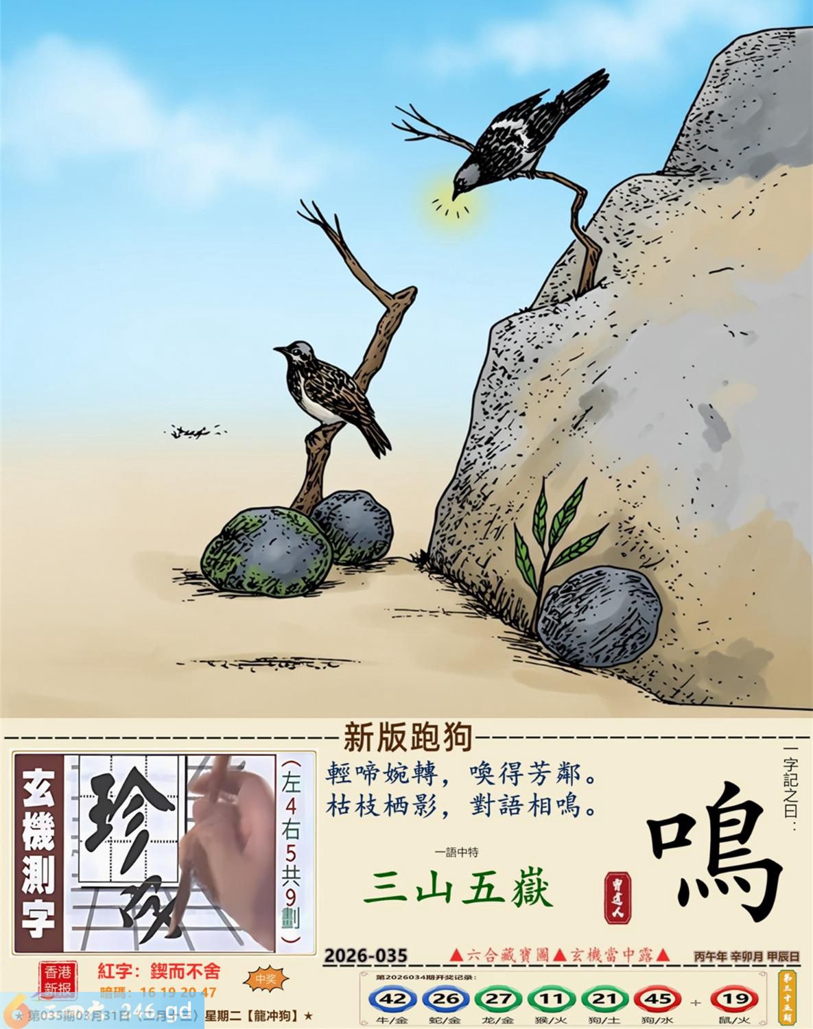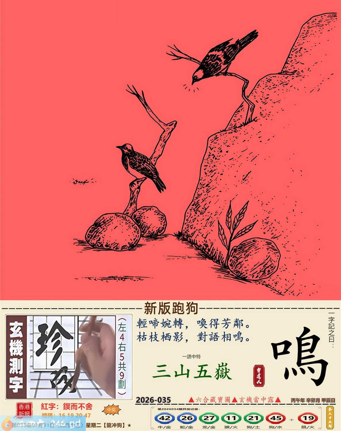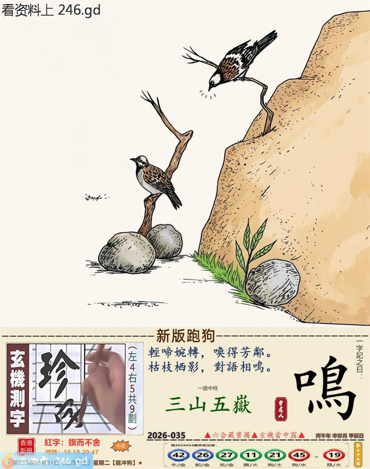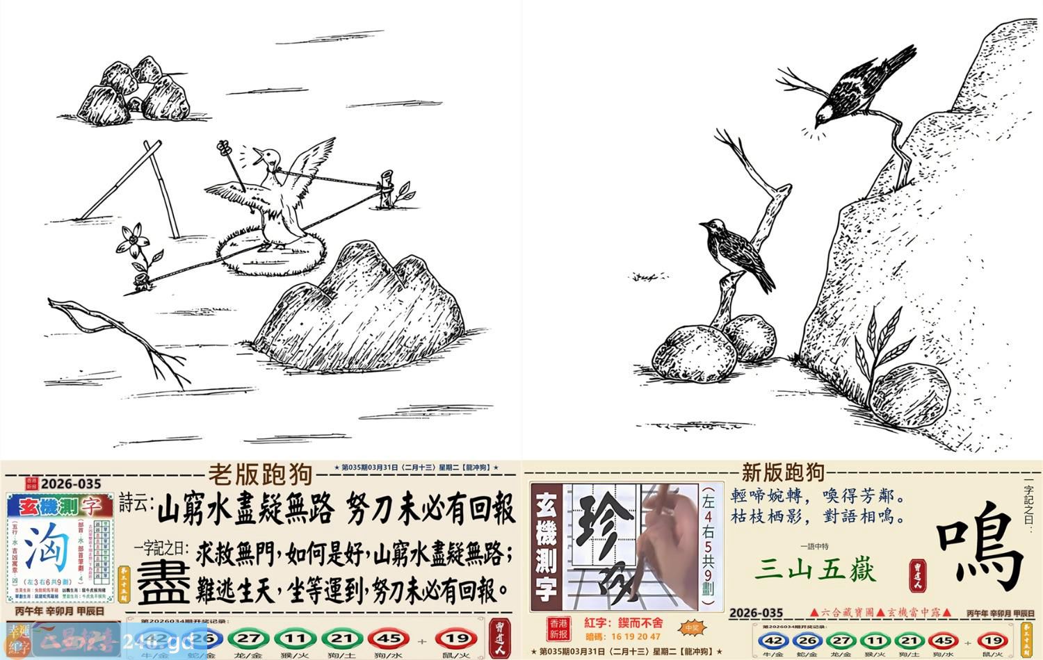 2026年3月31日二月十三星期二覆灯火龙日冲狗 035期:老版跑狗玄機一字記之曰:【盡】 詩云:山窮水盡疑無路,努力未必有回報。 求救無門,如何是好,山窮水盡疑無路; 難逃生天,坐等運到,努力未必有回報。 玄機測字:《洶》 密圖詩:一對核桃一對棗 記:試看宮中有月兔 特碼大小單雙句:伸手要錢 今期必中:黃月英 035期:特碼歇后語 千眼佛-----瞒不过 035期正版四字梅花诗:六根清净。 035期火车头:烧伤鸡。诗:牛死马伤,没有四脚水上走。 035期香港第一手欲钱料:三点。 035期曾道人说:“男人?” 035期另版四字梅花诗:农行理财。 035期香港第一手欲钱料:欲钱台湾金二角的大小。 035期曾道人说:“为什么年轻人喜欢开跑车”? 035期:二字经:红绿。 035期:床下有特码 035期:智力金壤:庖丁解牛 035期紅字:【鍥而不舍】 035期暗码:【16192047】 035期一語中特:【三山五嶽】 發財玄機圖:探索周圍儲備充足圖中明鼠藍綠 035期:藏寶圖 新:蕉留庭户因供字 老:日长暗记残香篆 禁:蛇禁:8尾玄機字《渐》 2026年035期【生活幽默】版 〖狗明星〗 有一天有一個人帶着一條狗到唱片公司,他説他是這條狗的經纪人,并說他這條狗會唱歌跳舞,老板不相信,就叫小狗表演一次。當音樂響起,小狗跟着音樂載歌載舞,老板目瞪口呆的看着小狗,一邊想着這一次撿到摇錢樹了,就趕快拿出合同希望與狗簽約,没想到忽然一條大狗衝進來,把小狗銜走了。 老板問:"怎磨回事?"經纪人無奈的表 示:"唉!那是他媽媽,他媽媽希望他兒子成爲一名醫生,演藝圈太復雜了!