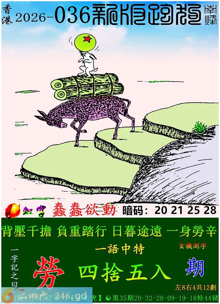036期跑狗一字記之曰:【勞】 背壓千擔,負重踏行。 日暮途遠,一身勞辛。 玄機測字:《期》 一語中特:四捨五入