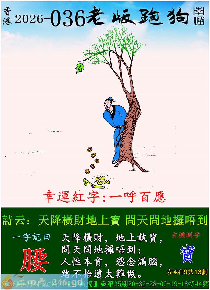 036期老版跑狗一字記之曰:【腰】 詩雲:天降橫財地上寶,問天問地攞唔到。