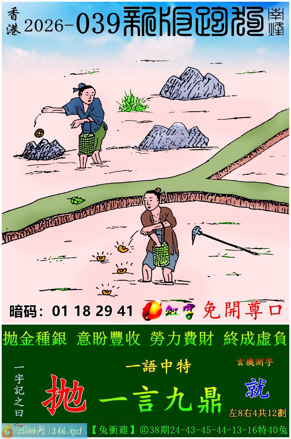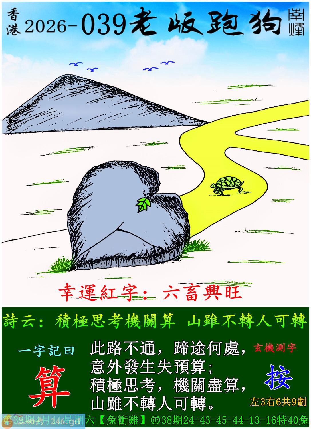2026年4月11日二月廿四星期六大溪水兔日沖雞 039期:老版跑狗玄機一字記之曰:【算】 詩云:積極思考機關算,山雖不轉人可轉。 此路不通,歸途何處,意外發生失預算; 積極思考,機關盡算,山雖不轉人可轉。 玄機測字:《按》 密圖詩:一臉懵逼買三四 記:落入平川斷其尾 特碼大小單雙句:登上寶座十二年 今期必中:馬岱 039期:特碼歇后語 雷婆找龙王谈心-----天涯海角觅知音 039期正版四字梅花诗:鸿雁传书。 039期火车头:烧伤马。诗:牛死猴伤,一六得二开三一。 039期香港第一手欲钱料:“小”。 039期曾道人说:“龙须?” 039期另版四字梅花诗:大城小爱。 039期香港第一手欲钱料:欲钱看西游记第十五回。 039期曾道人说:“为什么有的人坐车怕晕”? 039期:二字经:红绿。 039期:泥鳅是特码 039期智力金壤:愁眉苦脸 039期信箱紅字:【免開尊口】 039期【暗碼:01-18-29-41】 039期一語中特:【一言九鼎】 發財玄機圖:毛短色亮條紋細長圖中明虎紅藍 039期:藏寳圖 新:片心惆怅清平世 老:风声雷动鸣金铁 禁:猴禁:2尾玄机字《卓》 2026年039期【生活幽默】版 〖流言蜚語〗 某先生是地方上的名人。一天,他像往常一樣在書房裏例覽當日報紙,突然對妻子大聲喊道:"喂,安娜,你看到今天早報上的流言蜚語了嗎,真可笑!他們説,你收拾行装出走了。 你聽見了嗎?安娜,你在哪兒?安娜?啊!"先生對着空空的房間大喊道......