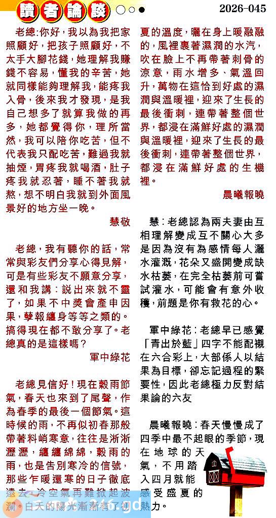 2026045期045期:彩民推荐〖貼信讀者論壇〗〖曾道人信箱〗