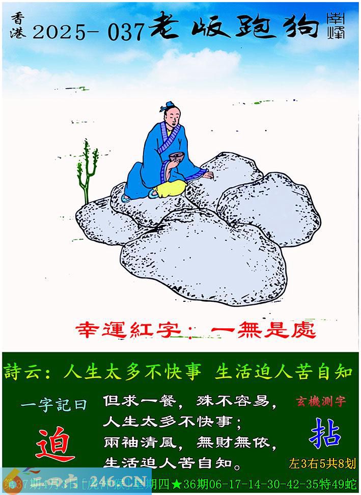 037期老版跑狗一字記之曰:【迫】 詩雲:人生太多不快事,生活迫人苦自知。 但求一餐,殊不容易,人生太多不快事; 兩袖清風,無財無依,生活迫人苦自知。 玄機測字:《拈》