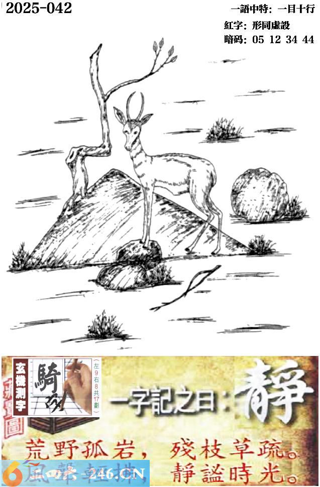 2025042期042期跑狗一字記之曰:【靜】 荒野孤巖,殘枝草疏。 風聲輕拂,靜謐時光。